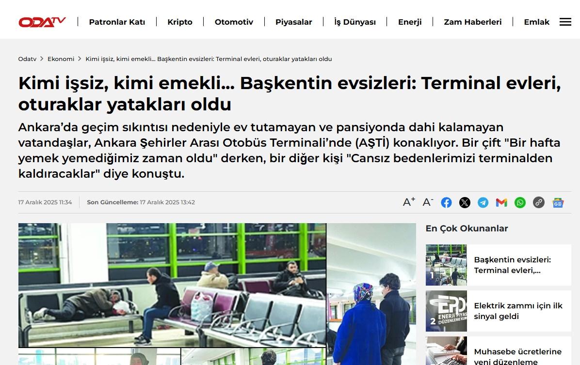 Halk TV, ODA TV ve T24 gibi gibi sosyal medya hesaplarından “Ev kirasını ödeyemeyen emekliler otogar köşelerine mahkum oldu! Hem de Meclis’in dibinde. Yoksulluk arttı, vatandaşlar evsiz kaldı” şeklinde haberler servis edildi.